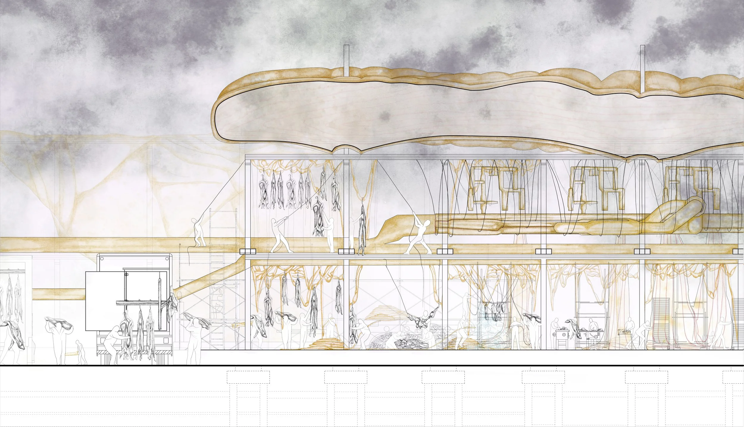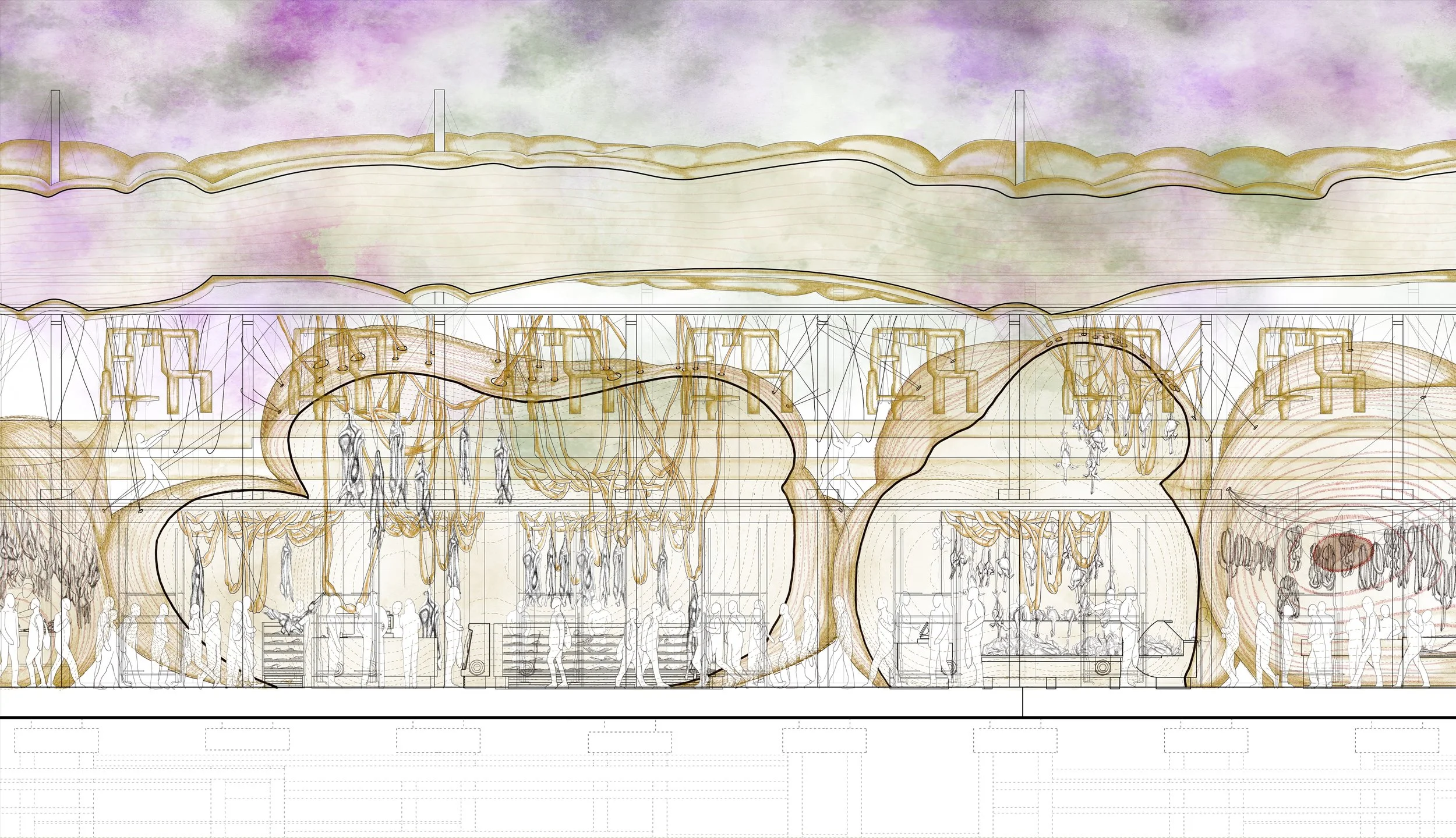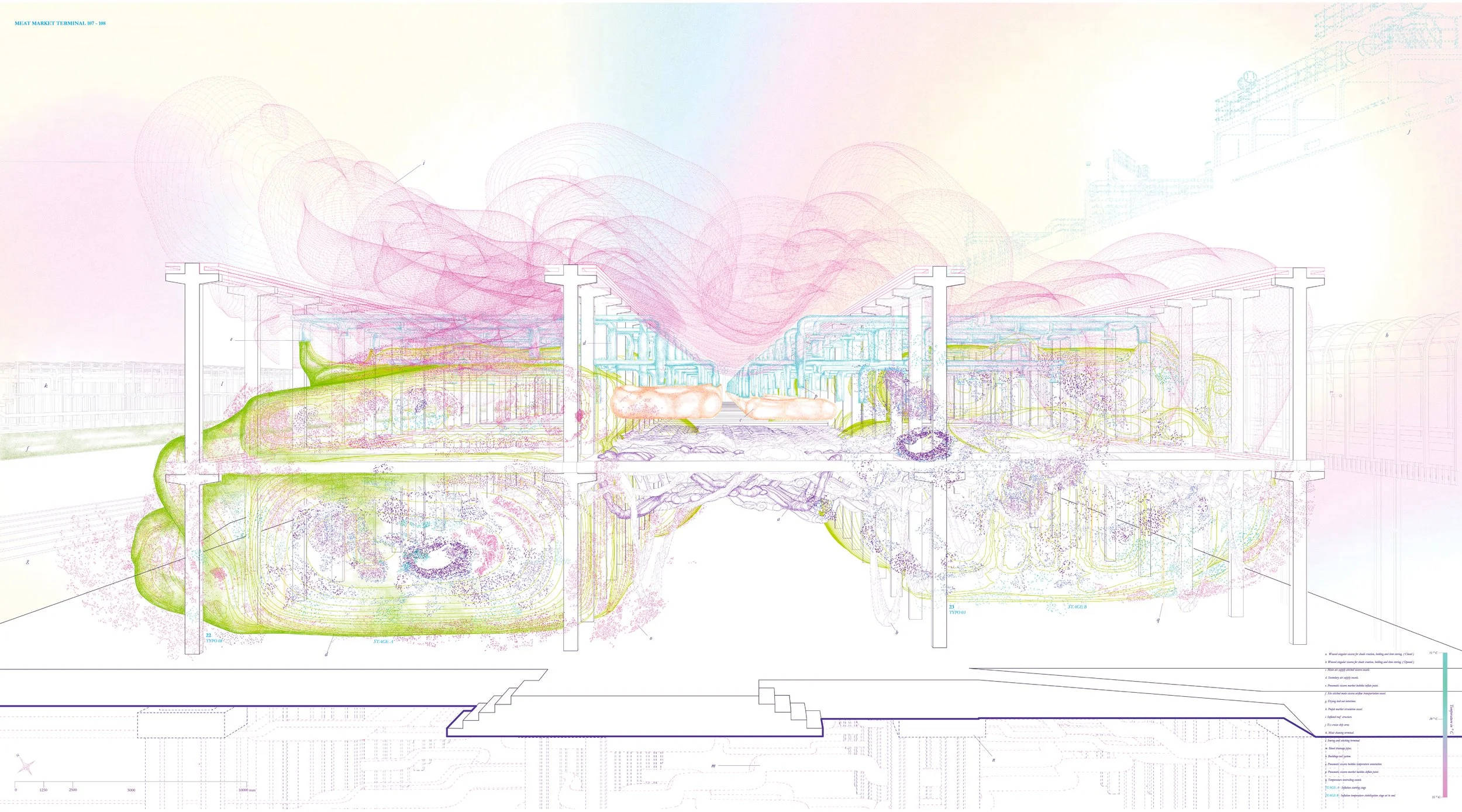 The proposal uses animal livestock waste, specifically viscera, as a new architectural commodity. These organic materials form pneumatic structures that shape the market space and create vessels for transporting air across the site.