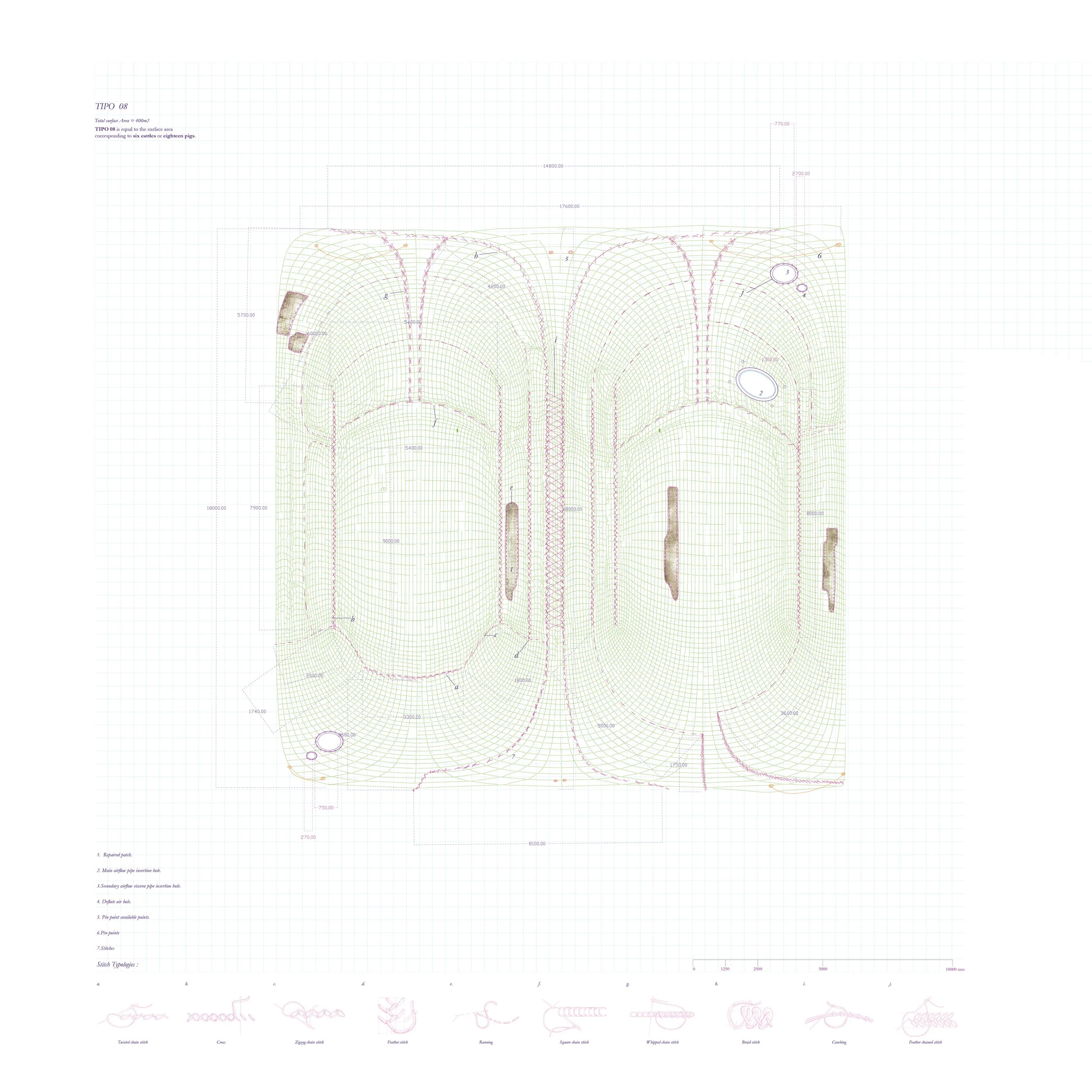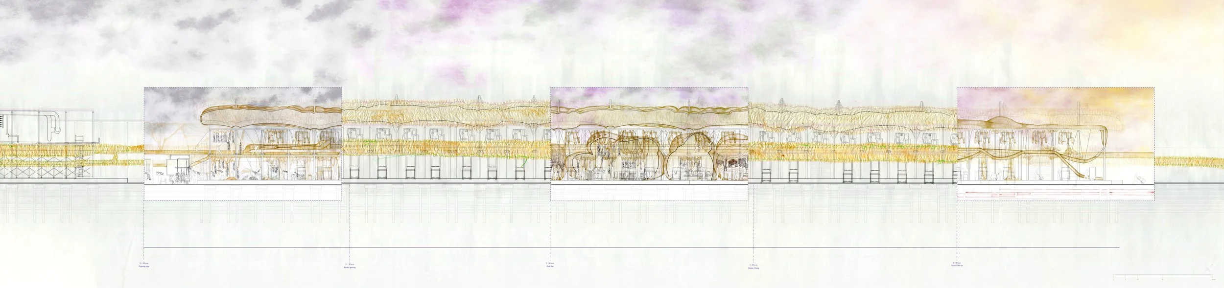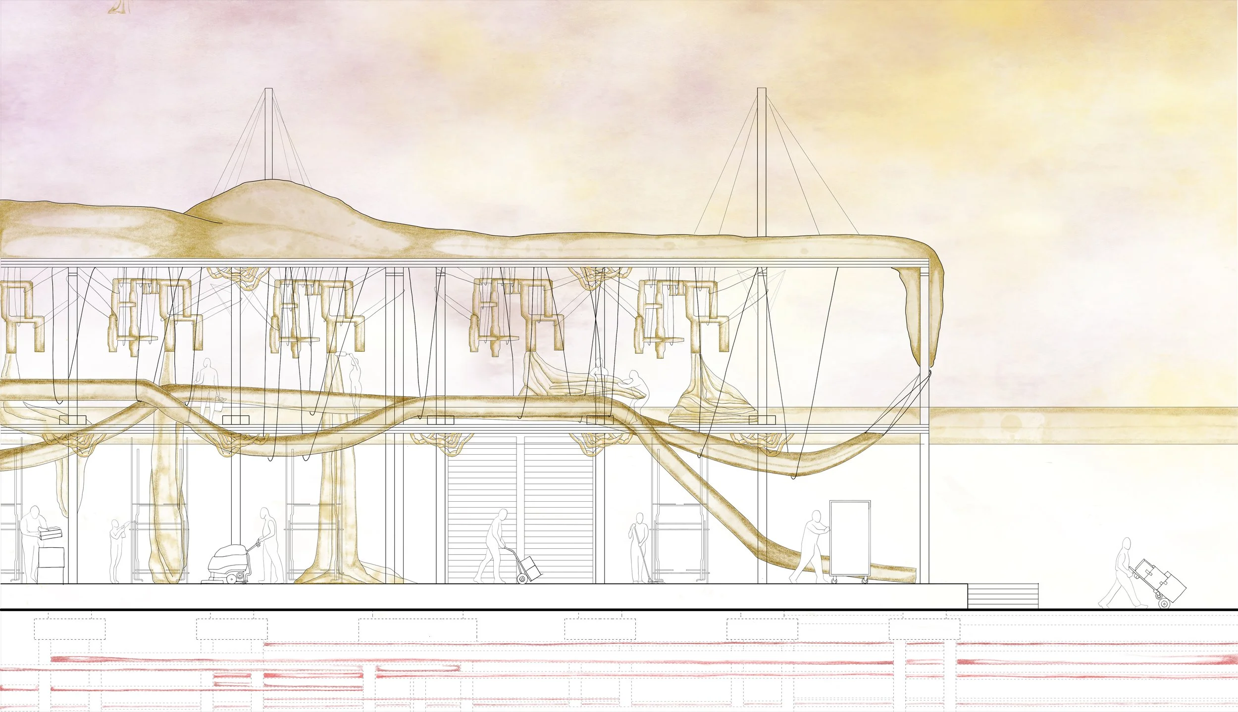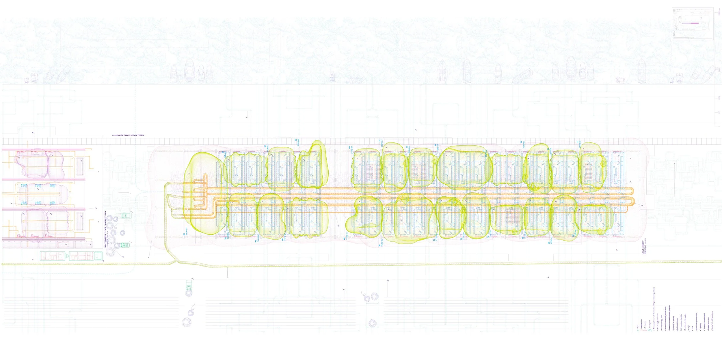 The proposal uses animal livestock waste, specifically viscera, as a new architectural commodity. These organic materials form pneumatic structures that shape the market space and create vessels for transporting air across the site.